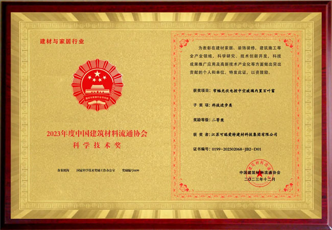 會(huì)議現(xiàn)場(chǎng),還頒發(fā)了2023年度中國(guó)建筑流通協(xié)會(huì)科學(xué)技術(shù)獎(jiǎng)。江蘇可瑞愛特建材科技集團(tuán)有限公司申報(bào)的“窄幅光伏電控中空玻璃內(nèi)置百葉窗”項(xiàng)目榮獲科技進(jìn)步類二等獎(jiǎng)項(xiàng)!