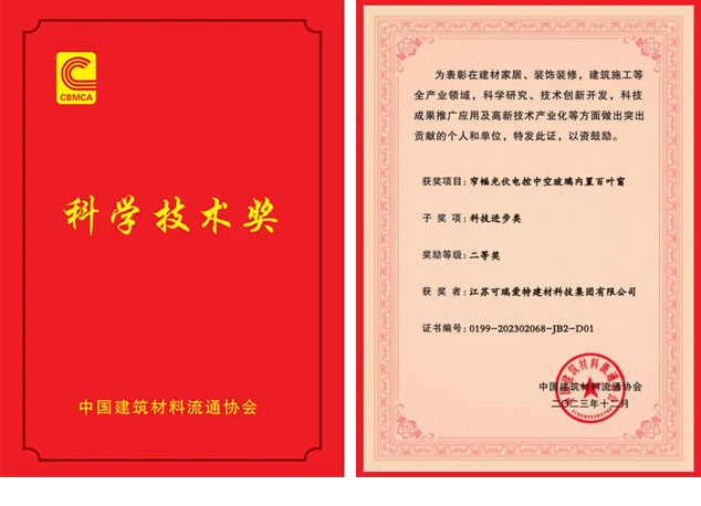 值得關(guān)注的是,此次是可瑞愛特第二次斬獲科學(xué)技術(shù)獎(jiǎng)。去年,可瑞愛特憑借自主研發(fā)的自供免接電“智能化光伏電控內(nèi)置百葉中空玻璃”也摘得科技類獎(jiǎng)項(xiàng)。雙重大獎(jiǎng)的認(rèn)可,也奠定了可瑞愛特在光伏電控內(nèi)置百葉中空領(lǐng)域的絕對(duì)的話語(yǔ)權(quán)和地位。