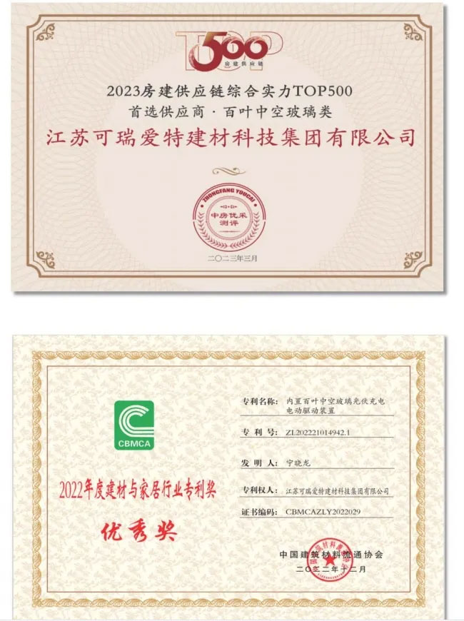 2022年,可瑞愛特科技集團(tuán)榮獲“中國(guó)內(nèi)置百葉中空玻璃產(chǎn)業(yè)化示范企業(yè)”并被商務(wù)部授予“中國(guó)誠(chéng)信檔案企業(yè)”,以及榮獲“江蘇省高質(zhì)量發(fā)展標(biāo)桿企業(yè)”、“江蘇省優(yōu)秀品牌企業(yè)”和揚(yáng)州政府授予的“揚(yáng)州市光伏電控內(nèi)置遮陽(yáng)百葉中空玻璃工程技術(shù)研究中心”、“科技創(chuàng)新先進(jìn)單位”和“納稅貢獻(xiàn)獎(jiǎng)”。另“可瑞愛特”牌高端內(nèi)置遮陽(yáng)百葉中空玻璃憑借優(yōu)秀的品質(zhì)和市場(chǎng)高占有率被中國(guó)住房和城鄉(xiāng)建設(shè)部列為2022年全國(guó)“建設(shè)行業(yè)科技成果推廣項(xiàng)目”、“全國(guó)內(nèi)置百葉中空玻璃行業(yè)質(zhì)量領(lǐng)先品牌”、“中空玻璃十大品牌”等權(quán)威榮譽(yù)。